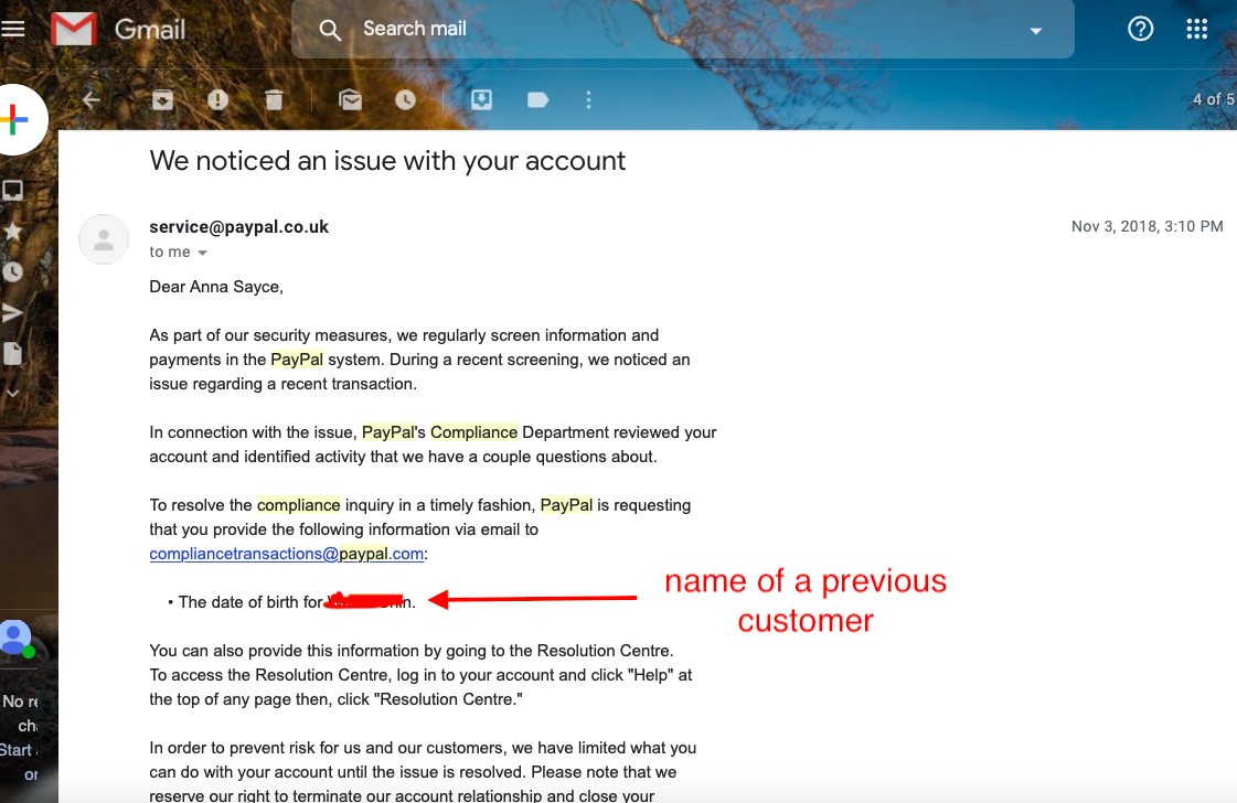 PayPal froze this payment and asked for further information from me — weirdly they asked me to provide a previous customer’s date of birth. Not mine, not the recipient’s, but a previous customer’s. Here’s the email asking for that: